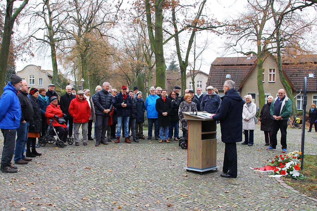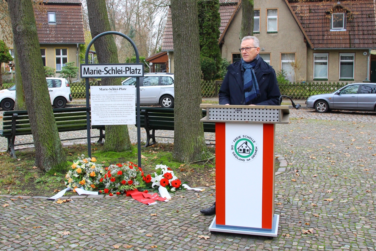 Das langjährige Vorstandsmitglied der Baugenossenschaft "Freie Scholle", Jürgen Hochschild, hielt eine kleine Gedenkrede, in der er an das Leben und die Lebensgeschichte Marie Schleis erinnerte. Andächtig lauschten die Zuhörer, unter denen auch die Tochter von Marie Schlei war, den Worten Hochschilds.