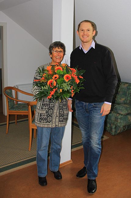 Die Baugenossin Ursula Gruchmann aus dem Schollenhof war die Jubilarin. Herr Griebenow beglückwünschte und überraschte Frau Gruchmann mit einem Blumenstrauß und einem kleinen Präsent.