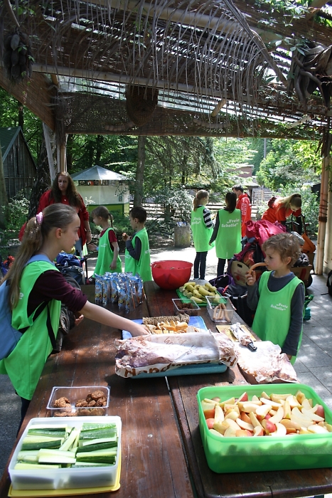 Zwischendurch gab es natürlich noch einen Abstecher auf den nächsten Spielplatz und man durfte den Papageien im Urwaldhaus beim Füttern zusehen. Dort gab es auch noch viele andere Tiere zu sehen, z.B. Fledermäuse, die aus ihren Futternäpfen Orangen und anderes Obst aßen und sich auf ihr Futter setzten, um es zu verteidigen. Einige Kinder gingen auch zum Streichelzoo und fütterten dort Ziegen und Schafe.