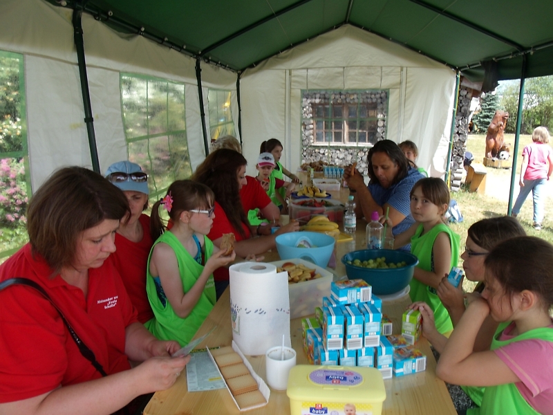 Zwischendurch stärkten sich die Kinder mit Würstchen, Buletten, Baguette, Bananen, Melone und anderem Obst und Gemüse und kalten Getränken. Einige Begleiterinnen waren währenddessen mit dem Aufhängen der nassen Kleidung beschäftigt.