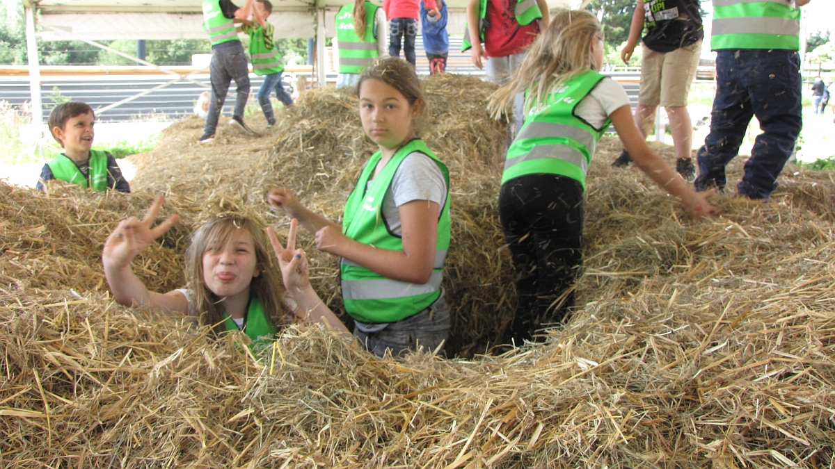 Pünktlich um 9:30 Uhr fuhr der Bus mit 43 Kindern und 7 Begleitpersonen los. Nach ca. 2 Stunden Fahrtzeit waren wir endlich am Ziel. Nachdem wir einen Picknickplatz erobert hatten, liefen die Kinder auseinander, um das Gelände zu erkunden. Da gab es viel zu entdecken. Angefangen vom Heuzelt, den Lamas, Kamele, freilaufende Esel, Ponys, bis zu einigen Spielgeräten.