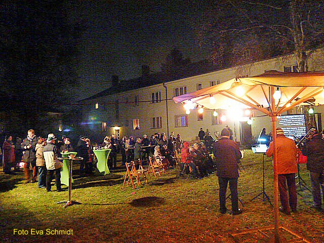 Der Bläserchor der Kirchengemeinde Alt-Wittenau spielte stimmungsvoll Advents- und Weihnachtslieder und ca. 60 bis 70 Baugenossinnen und Baugenossen der Siedlungen Alt-Wittenau und Rosentreterpromenade sangen dazu mehr oder weniger stimmungsvoll aber textsicher alle Lieder mit allen Strophen.