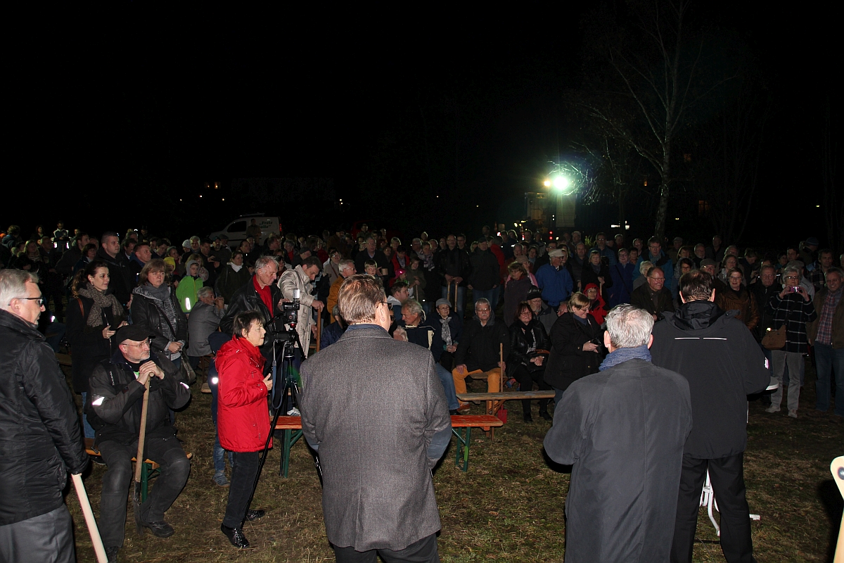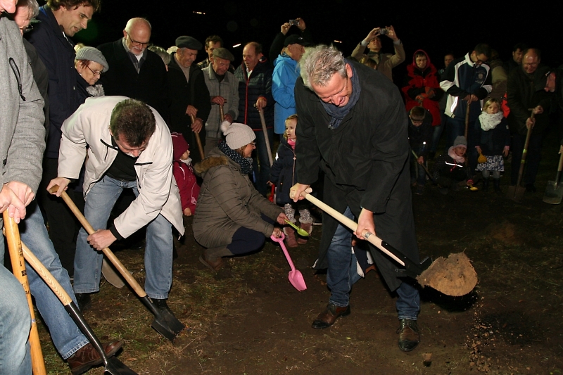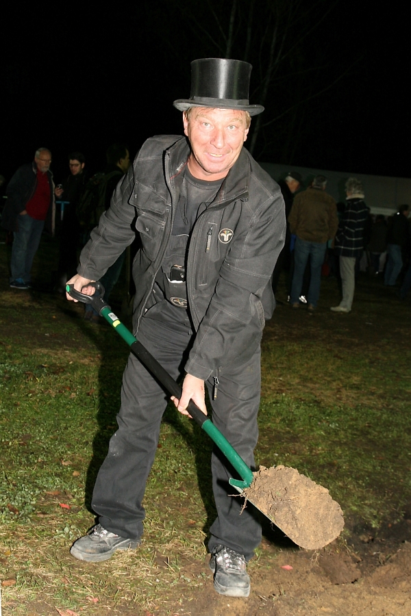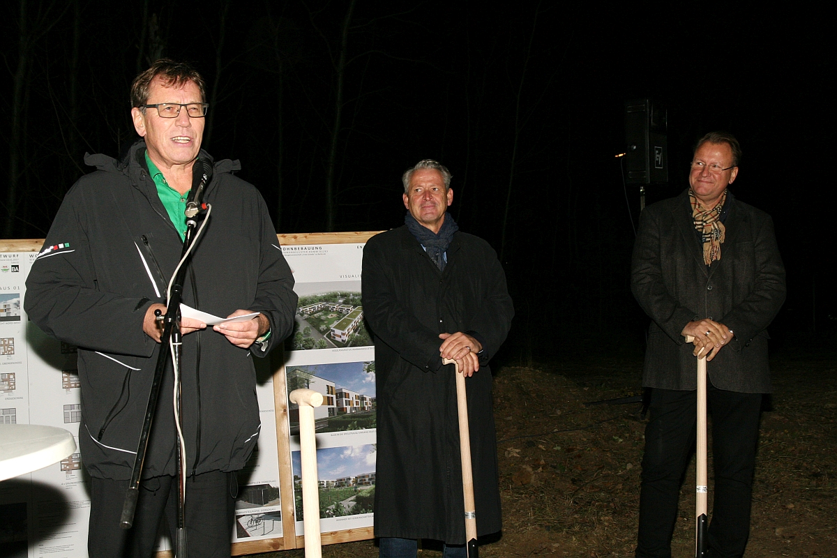 Der kaufmännische Vorstand der Baugenossenschaft "Freie Scholle" Hans-Jürgen Hube (links) war von der Vielzahl der Helfer, die mit einem Spaten kamen, sichtlich erstaunt, als er pünktlich um 18:00 Uhr die Veranstaltung mit seiner Rede eröffnete.