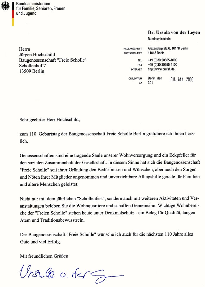 01.02.2006 - Bundesministerin Dr. Ursula von der Leyen gratuliert der "Freien Scholle" zum 110jährigen Bestehen