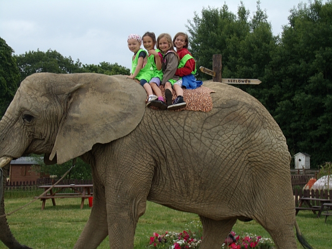 Nach der einstündigen Show ging es wieder hinaus. Als dann die Elefanten kamen, durften alle die Elefanten mit Toastbrot füttern und danach auf den ihnen reiten. Das war ein riesen Spaß. Die Kinder und auch einige Begleiter nahmen auf dem Rücken der Elefanten Platz. Das gab ein Gelächter und Gekreische, dass wir uns schon wunderten, dass die Elefanten dabei so ruhig blieben. Nach kurzer Stärkung am Buffet – es gab Buletten, Würstchen, Äpfel, Bananen, Melone, Salatgurke, Saft und einiges mehr – ging es los, zum Trampolin, oder zum Heuzelt, zu den Meerschweinchen oder Ponyreiten. Jetzt stand schon die nächste Vorführung an, die Seelöwenshow. Die beiden Seelöwen Itchy und Scratchy brachten alle durch ihre lustigen Kunststücke zum Lachen.