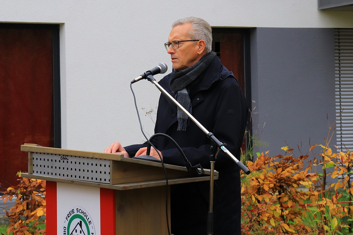 Nachdem auch der stellvertretende Bezirksbürgermeister und Bezirksstadtrat für Wirtschaft, Gesundheit, Integration und Soziales Uwe Brockhausen ein paar Worte an die Besucher der Veranstaltung gerichtet hatte, übergab er das Wort an das ehemalige Vorstandsmitglied der "Freien Scholle" Jürgen Hochschild.