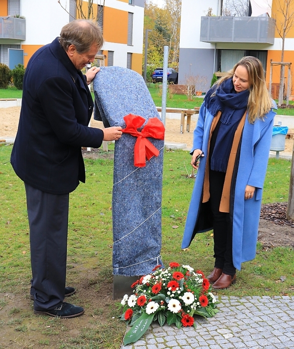 Im Anschluss an den Vortrag von Jürgen Hochschild enthüllten die Vorstandsmitglieder der Baugenossenschaft "Freie Scholle" Lidija Arndt und Hans-Jürgen Hube die extra angefertigte Gedenkstehle im Zentrum des Grundstücks.