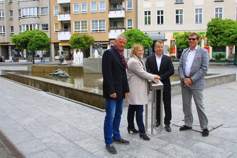 Wie schon im Vorjahr war der Springbrunnen am Franz-Neumann-Platz der Austragungsort zum Start in die neue Brunnensaison. Pünktlich um 11:00 Uhr drückten der Reinickendorfer Bezirksbürgermeister Frank Balzer (2. v. r.) zusammen mit der Bezirksstadträtin Katrin Schultze-Berndt (2. v. l.) und dem Vorstand der Baugenossenschaft "Freie Scholle", bestehend aus Hans-Jürgen Hube (r.) und Michael Schulze (l.), symbolisch für alle 13 Brunnen im Bezirk Reinickendorf den Startknopf.