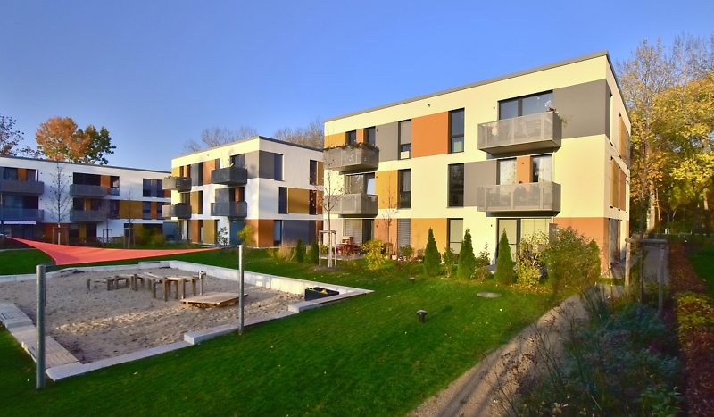 In der Zeit knappen und teuren Baulands ist es immer schwieriger geworden, Flächen zu finden, die sowohl zum Bauen geeignet sind als auch wirtschaftlich in Frage kommen. … Auf der zu Verfügung stehenden Fläche wurden vier Wohngebäude mit den dazugehörigen Flächen für Grünanlagen, Spielplätze, Stellplätze und Erschließung untergebracht. Die Terrasse der Erdgeschosswohnungen sind durch einen Grünstreifen vom Wegesystem abgesetzt, das die gemeinschaftlich nutzbare Flächen verbindet."