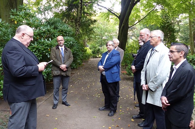 Am Ehrengrab von Franz Neumann richtete der Vorsitzende der Arbeiterwohlfahrt, Herr Hans Nisblé (links), im Beisein des stellvertretenden Vorsitzenden der Berliner SPD, Herrn Fritz Felgentreu (2. v.l.) und dem Vorstandsmitglied der Baugenossenschaft "Freie Scholle", Herrn Jürgen Hochschild (2. v.r.), im Rahmen einer Kranzniederlegung ein paar Worte an die Anwesenden, die wir an dieser Stelle gern veröffentlichen möchten: "Sehr geehrte Damen und Herren, liebe Freundinnen und Freunde, lieber Fritz Felgentreu, lieber Jürgen Hochschild, wir haben uns wie in jedem Jahr hier versammelt, um Franz Neumann zu gedenken. Hier in der "Freien Scholle" hat Franz Neumann viele Jahre seines Lebens verbracht, von 1945 bis zu seinem Tode lebte er im Moorweg. Heute erinnern wir an seinen 40. Todestag. Franz Neumann hat sein ganzes Leben der Demokratie und der Freiheit gewidmet. Berlin ist immer eine Stadt des Widerstands gewesen. Auch wenn Franz Neumann diesen Satz im Zusammenhang mit dem Widerstand gegen das Dritte Reich geprägt hat, ist sein Leben insgesamt ein Leben des Widerstands. Ein Leben, das geprägt war vom Widerstand gegen den Nationalsozialismus und vom Widerstand gegen die Vereinigung von SPD und KPD. Auch während seiner fast 30 Jahre als Vorsitzender des Landesverbandes der Berliner Arbeiterwohlfahrt setzte er als Querdenker wichtige Impulse über den Tag hinaus. Unter den Nationalsozialisten wurde er mit anderen Widerstandskämpfern festgenommen und verhaftet. Ihm wurde der Prozess wegen Hochverrats gemacht und er erhielt eineinhalb Jahre Gefängnis und saß in der Haft in Berlin und im Konzentrationslager Oranienburg. Auch nach seiner Entlassung hält er Kontakt zu den Tarnorganisationen der Berliner Sozialdemokratie. Bereits im ersten Jahr nach Kriegsende gehörte Franz Neumann zu den Wiedergründern der SPD und entwickelte sich zu einem Führer der innerparteilichen Opposition gegen die Vereinigung mit der KPD. Schon im Juni 1945 wird Franz Neumann Kreisvorsitzender der SPD Reinickendorf und verfolgt dabei vor allem zwei Ziele: den Wiederaufbau der Parteiorganisation und den Einzug in die Rathäuser. Er nahm verschiedenste Aufgaben in der Politik wahr. So war er Vorsitzender der Berliner SPD von 1956-1958, Mitglied des Landesparlaments von 1946-1960, Bundestagsabgeordneter von 1949-1969 und von 1946 bis zu seinem Tod Mitvorsitzender der Berliner Arbeiterwohlfahrt, gemeinsam mit Ida Wolff, Louise Schroeder und Lore Lipschitz. In all diesen Aufgaben war er ein Garant für Frieden, Freiheit und Solidarität. Auch 40 Jahre nach seinem Tod werden wir ihn in dankbarer Erinnerung behalten. Für uns, die heute Verantwortung tragen, wird er stets ein Vorbild bleiben." Auch die Schollaner werden ihren Franz Neumann nicht vergessen.