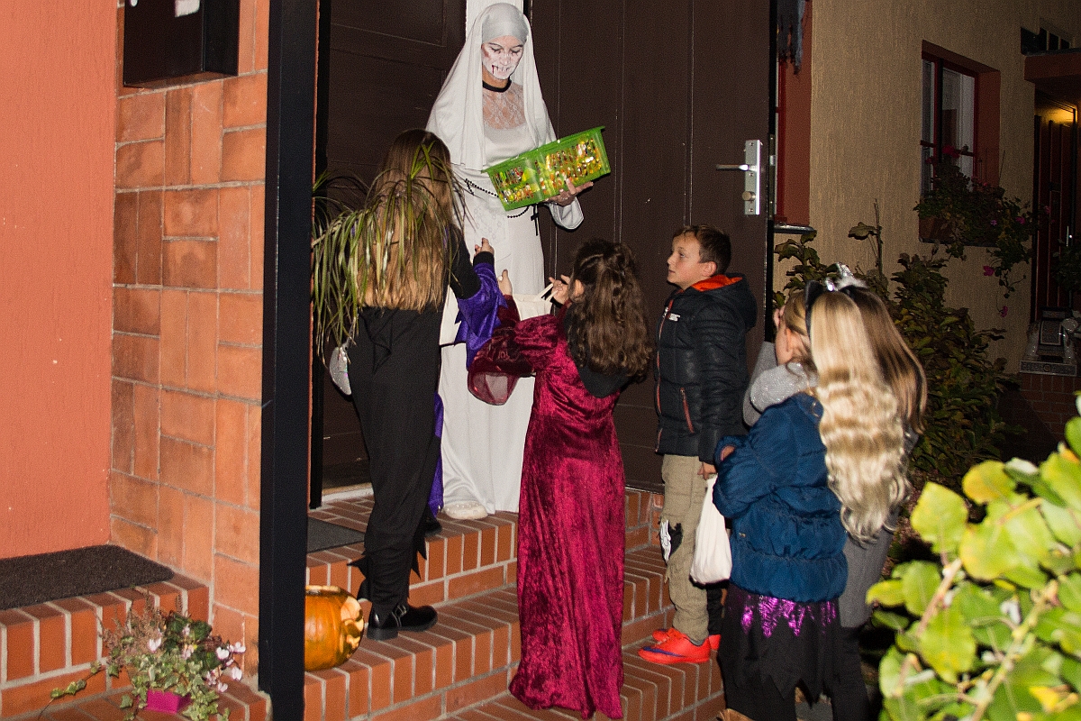 Der Meister öffnete die Tür und zauberte und verzauberte die kleinen Geister mit seiner Hexenkunst. Im Hintergrund hörte man die unheimliche Stimme seiner Schwester. Aber Karl versprach den Geistern, dass die Hexe nicht rauskommen würde. So zogen die kleinen Gespenster, nachdem ihre Taschen mit Süßigkeiten gefüllt waren, weiter.