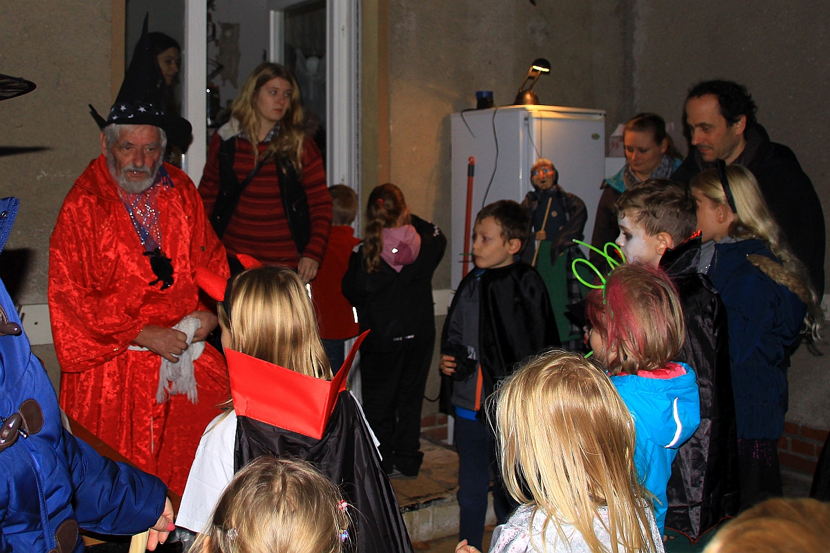 Im Spukhaus versammelten sich auch in diesem Jahr wieder über 50 kleine und große unheimlich gruselig aussehende Gestalten. Sie warteten bis die Dunkelheit einkehrte, um dann durch die Straßen der "Scholle" zu ziehen. Sie spukten von Haus zu Haus und fragten nach Süßigkeiten. Einige klingelten an der Tür des Hexenmeisters Karl und dessen Schwester Hexeline.