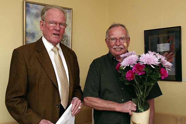 „Das Ergebnis“, fuhr er fort, „können Sie hier und heute sowie an den nächsten sechs Wochenenden bewundern, studieren und vergleichen. Die Palette der Fertigungstechniken, Formen und Farben ist breit und zeugt von der unendlichen Vielfalt künstlerischer Begabungen unserer Mitbürger in der ´Freien Scholle` und in ganz Reinickendorf.“ Hans Seider nahm die Gelegenheit zum Anlass, Ulrich Rohmann speziell auch im Namen des Beirats für seinen stetigen Einsatz bei der Vorbereitung, Organisation und Präsentation zu danken und überreichte ihm einen Blumenstrauß.