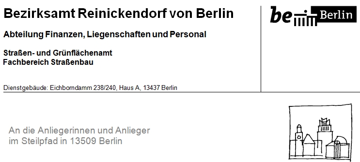 Das Straßen- und Grünflächenamt des Bezirks Reinickendorf plant im Zeitraum vom 01.07.2016 bis 19.08.2016 den östlichen Gehweg im Steilpfad zwischen Waidmannsluster Damm und Erholungsweg instand zu setzen. Die Anwohner werden mit einem allgemeinen Schreiben hierüber informiert.