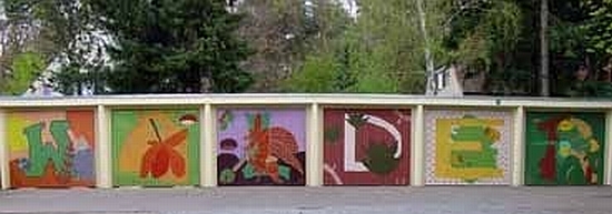Mit Schülern und Lehrern der Paul-Löbe-Schule haben wir deshalb über Monate hinweg ein besonderes Projekt geplant. Die Vorbereitung dieser Arbeiten fand im Rahmen des Regelunterrichtes Bildende Kunst in einer 8. Klasse dieser Hauptschule statt. Im Unterricht wurden 1 x 1 m große Entwürfe von den Schülern entwickelt. Bei den Arbeiten wurden die Schüler nicht nur von 2 Kunstlehrerinnen, sondern auch von dem Künstler Manfred Fuchs unterstützt. Das künstlerische Ziel lautete: Die Garagentore mit Natur-Landschaften der umliegenden Umgebung des Steinbergparks anzupassen. Die Jugendlichen haben dafür Motive aus der heimischen Tier- und Pflanzenwelt gewählt.