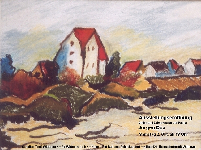 Rechtzeitig zu Ende der Ferienzeit und zu Beginn der etwas kühleren Jahreszeit wird in unserer Kiez-Galerie eine neue, sehenswerte Ausstellung eröffnet. Wir laden Sie am Samstag, dem 2. Oktober 2010, um 18:00 Uhr zur Ausstellungseröffnung "Bilder und Zeichnungen auf Papier" von Jürgen Dox ein.