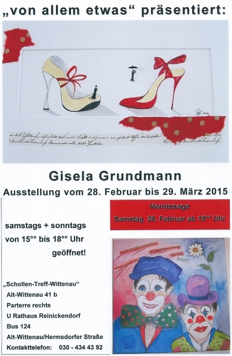 Am Samstag, dem 28. Februar 2015, findet im Schollen-Treff-Wittenau die Vernissage der nächsten Kunstausstellung "von allem etwas" von Gisela Grundmann statt. Beginn ist diesmal bereits um 15:00 Uhr.