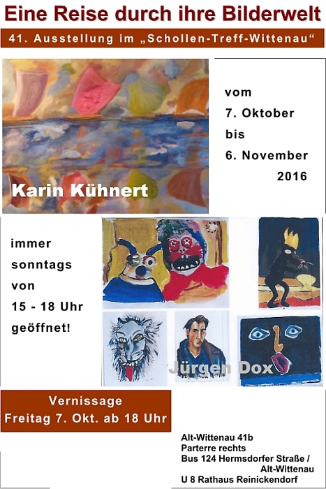 Am Freitag, dem 7. Oktober 2016, findet ab 18:00 Uhr im Schollen-Treff-Wittenau die Vernissage der nächsten Kunstausstellung "Eine Reise durch ihre Bilderwelt" von Karin Kühnert und Jürgen Dox statt.