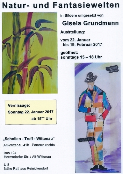Am Sonntag, dem 22. Januar 2017, findet ab 15:00 Uhr im Schollen-Treff-Wittenau die Vernissage der nächsten Kunstausstellung "Natur- und Fantasiewelten" von Gisela Grundmann statt.