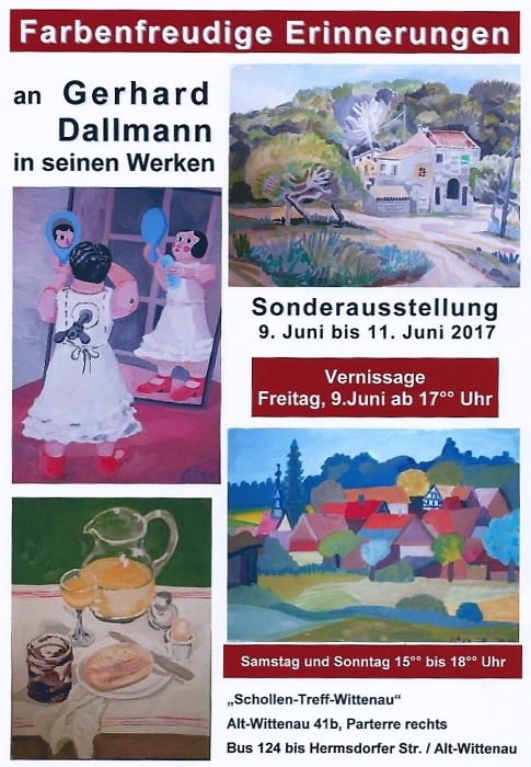 Am Freitag, dem 9. Juni 2017, findet ab 17:00 Uhr im Schollen-Treff-Wittenau die Vernissage der nächsten Kunstausstellung "Farbenfreudige Erinnerungen" an Gerhard Dallmann statt.