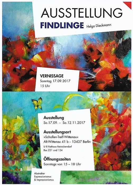 Am Sonntag, dem 17. September 2017, findet ab 15:00 Uhr im Schollen-Treff-Wittenau die Vernissage der nächsten Kunstausstellung "Findlinge" von Helga Dieckmann statt.