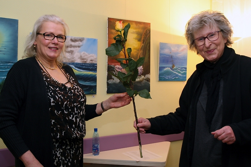 Von Ausstellungsbesucherin Helga Dieckmann (re.) bekam die Malerin eine langstielige Rose geschenkt.