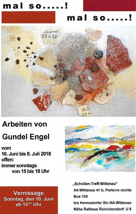 Am Sonntag, dem 10. Juni 2018, findet ab 15:00 Uhr im Schollen-Treff-Wittenau die Vernissage der nächsten Kunstausstellung "Mal so, ... mal so!" Arbeiten von Gundel Engel statt. Hierzu laden wir alle Kunst-Interessierten ganz herzlich ein.