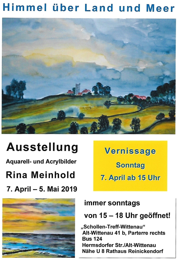 Am Sonntag, dem 7. April 2019, findet ab 15:00 Uhr im Schollen-Treff-Wittenau (Alt-Wittenau 41b) die Vernissage der nächsten Kunstausstellung