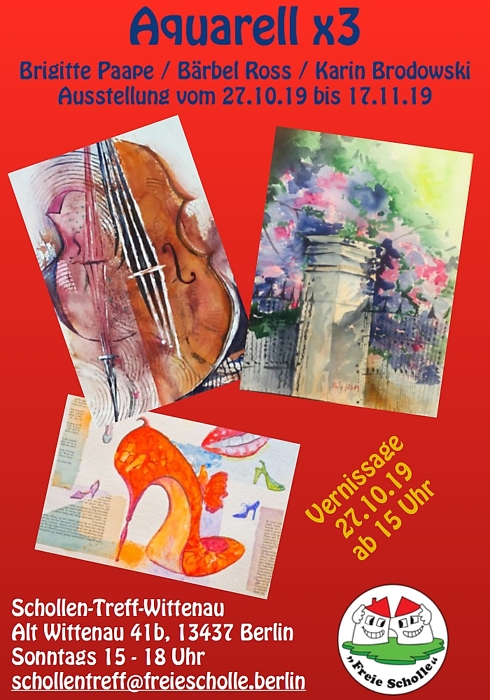 Am Sonntag, dem 27. Oktober 2019, findet ab 15:00 Uhr im Schollen-Treff-Wittenau (Alt-Wittenau 41b) die Vernissage der nächsten Kunstausstellung