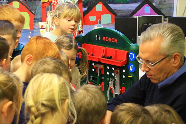 Nun enthüllte Jürgen Hochschild das erste und auch mit Abstand größte Geschenk. Voller Neugier drängten sich alle Kinder so weit nach vorn, wie sie nur konnten. Was mochte sich wohl unter dem roten Tuch verbergen?