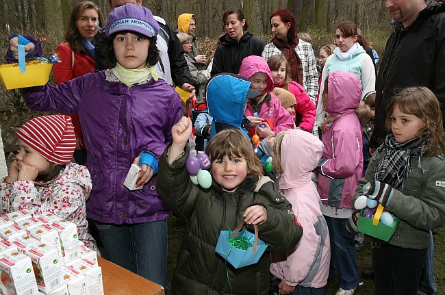 Pünktlich um 11:00 Uhr machten sich die 58 Kinder zusammen mit ihren Eltern und dem Osterhasen auf den Weg. Zuvor erhielt jedes Kind ein mit einem Motiv versehenes und etwas Wegzehrung gefülltes Osterkörbchen. Jedes Kind war bemüht nur Eier mit dem Motiv zu sammeln, das auf seinem Körbchen abgebildet war. So mussten die älteren und somit größeren und schnelleren Kinder andere Ostereier einsammeln, als die jüngeren und etwas bedächtiger vorgehenden Kinder.