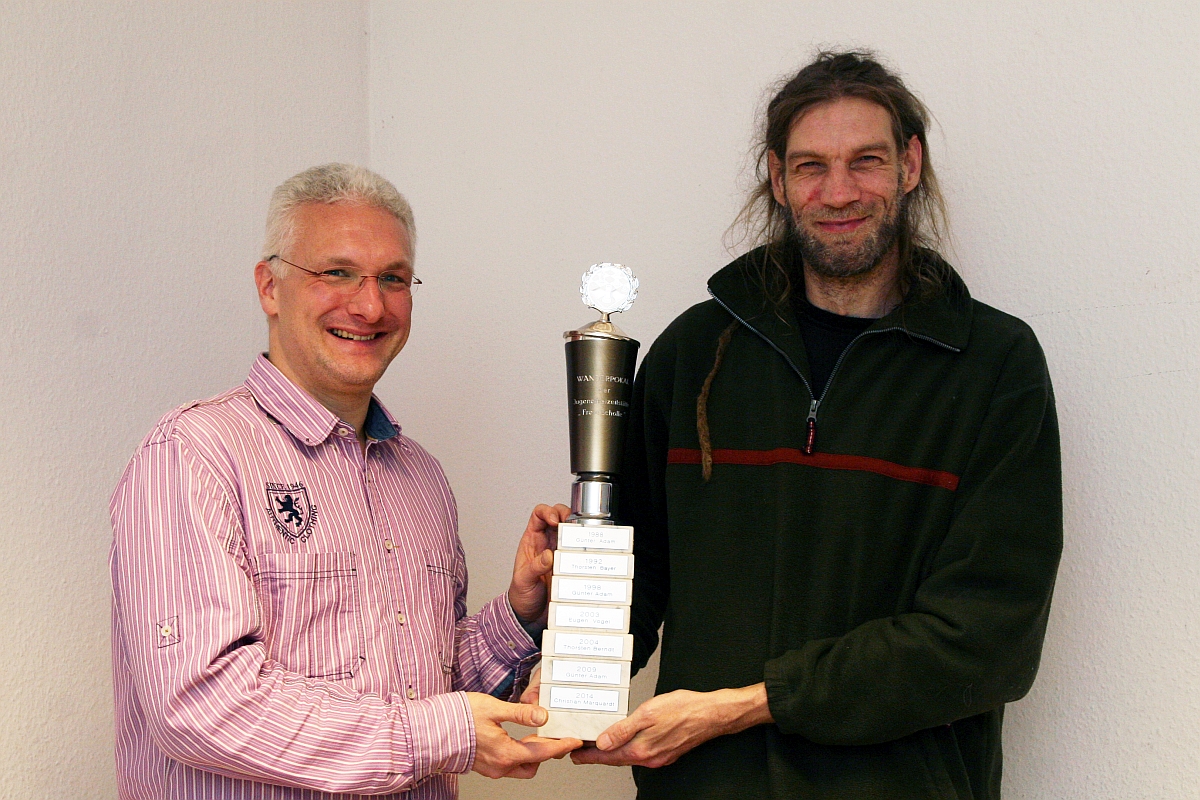 Nach fünf Stunden Spielzeit stand der Champion des Jahres 2017 fest. Gewonnen hat in diesem Jahr erneut „Seriensieger“ Thorsten Berndt (rechts), der von Turnierorganisator Christian Marquardt (links) den Wanderpokal der Baugenossenschaft "Freie Scholle" überreicht bekam.