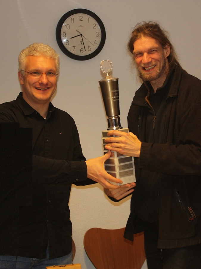 Champion des Jahres 2018 war erneut "Seriensieger" Thorsten Berndt (rechts), der von Turnierorganisator Christian Marquardt (links) den Wanderpokal der Baugenossenschaft "Freie Scholle" überreicht bekam.