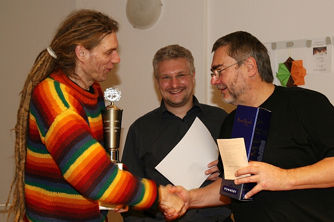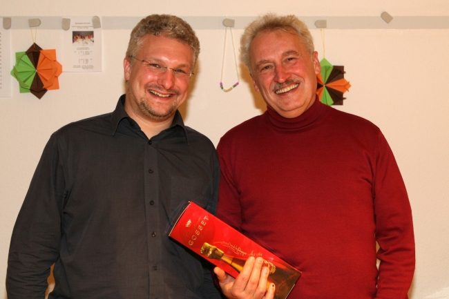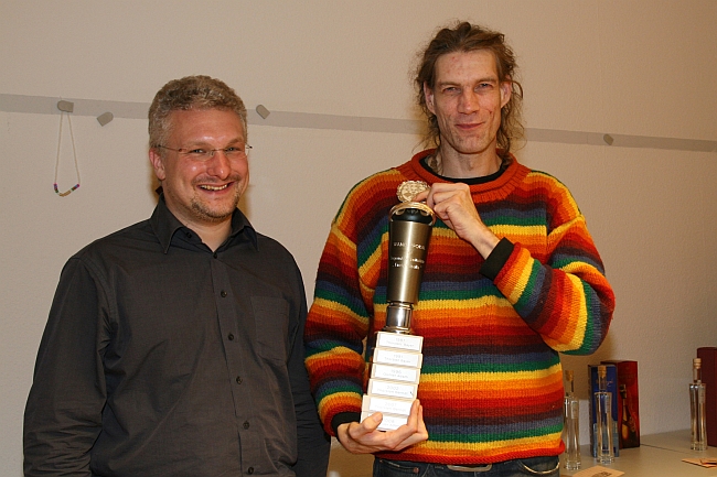 Gewonnen hat in diesem Jahr Thorsten Berndt (rechts), der um 20:45 Uhr von Turnierorganisator Christian Marquardt (links) den Wanderpokal der "Freien Scholle" überreicht bekam.
