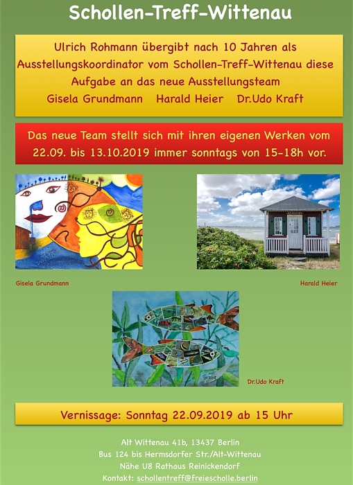 Er stellte sich sowie sein Ausstellungsteam Gisela Grundmann und Dr. Udo Kraft kurz vor und lud die Anwesenden zur Vernissage der Kunstausstellung am Sonntag, dem 22. September 2019, im Schollen-Treff-Wittenau ein.