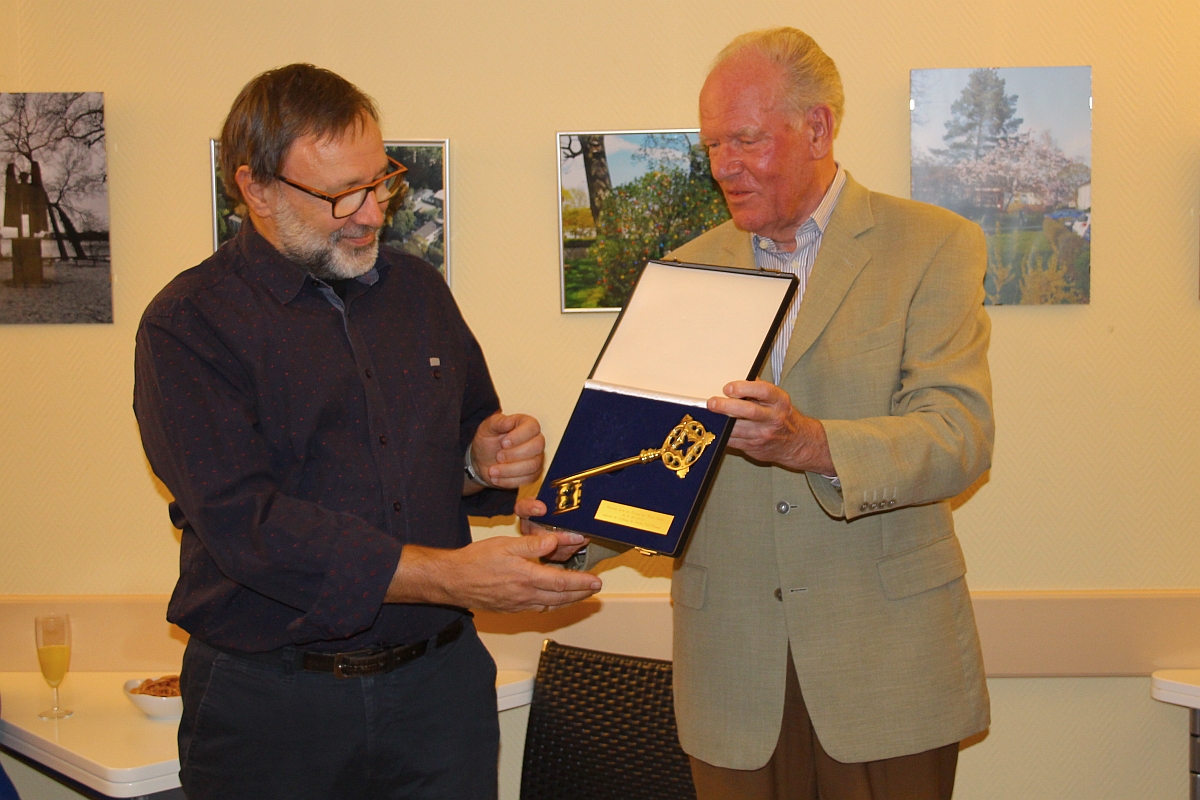 Anschließend übergab Hans Seider den "symbolischen Schlüssel" für den "Schollen-Treff-Wittenau" an den neuen Koordinator Harald Heier. Harald Heier ist seit vielen Jahren Bewohner der benachbarten Siedlung Rosentreterpromenade sowie Mitglied des Beirats der "Freien Scholle".