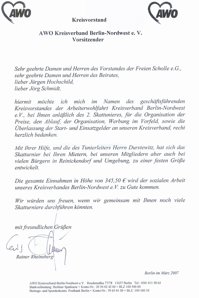 Der Vorsitzende des AWO Kreisverbandes Berlin-Nordwest e.V., Herr Rainer Rheinsberg, hat sich bei der "Freien Scholle" mit einem Brief für die Hilfe bei der Organisation des Skatturnieres 2007 bedankt. Hier das Dankesschreiben: