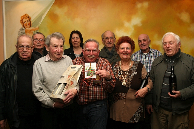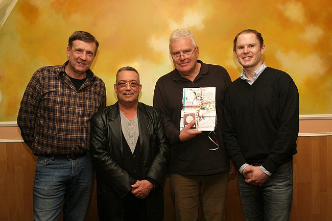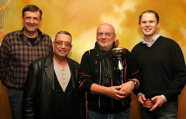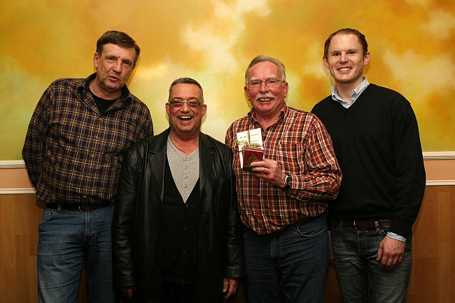 Der Baugenosse Ulrich Rohmann (zweiter von rechts) von der Skatgruppe „Schollen-Treff-Wittenau“ erspielte sich mit 2.163 Punkten den 3. Platz und bekam dafür einen Gutschein im Wert von 50,- EUR des Restaurants „Schollenkrug“.