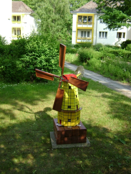 In Miniaturformat, dennoch mehr als ein Meter hoch, hatte der Baugenosse Harry Krümel detailgenau eine Windmühe angefertigt. Die exakte Ausführung sorgt dafür, dass sie sich bei dem geringsten Windstoß dreht und jede Mieterin, jeden Mieter und die Besucher der Siedlung seither erfreut, ja, ihnen signalisiert "woher der Wind weht".