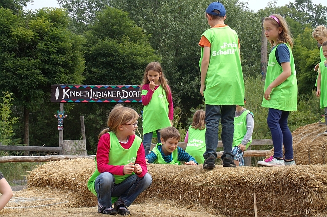 Als alle "Cowboys" und "Indianer" im Bus saßen und die Häuptlinge ihre Plätze eingenommen hatten, fuhr unser Feldwebel „Reiner“ (so hieß unser Busfahrer) los. Nach einer 1 ½ stündigen Fahrt waren wir angekommen. Jetzt nur noch schnell anmelden, bezahlen und hinein in den "Wilden Westen". Wir mussten etwas aufpassen, denn hier verkehrte regelmäßig eine Postkutsche und Siedler mit ihren Planwagen fuhren an uns vorbei. Nach einigen Schritten entlang der Hauptstraße machten am Spielplatz halt. Dann ging es weiter zum See. Hier durften die Kinder nach Gold suchen. Bewaffnet mit Blechschüsseln ging es hinein ins kühle Nass. Manche mit Badesachen, einige mit Unterwäsche und Schollenhemdchen und andere in mit kompletter Bekleidung. Das war ein Spaß.