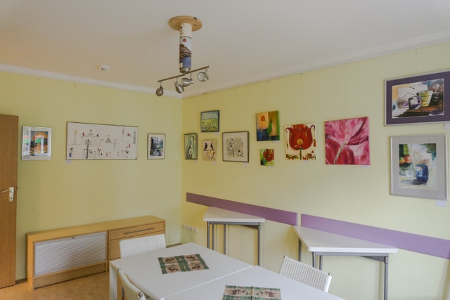 Hängevorrichtungen sind vorhanden; Rahmen können begrenzt zur Verfügung gestellt werden. Wir sind Ihnen gerne bei der Auswahl der Bilder, beim Aufhängen und der Bekanntmachung der Ausstellung behilflich.