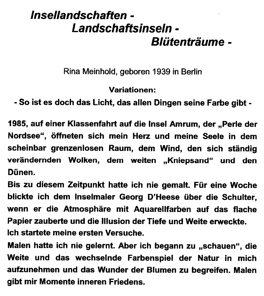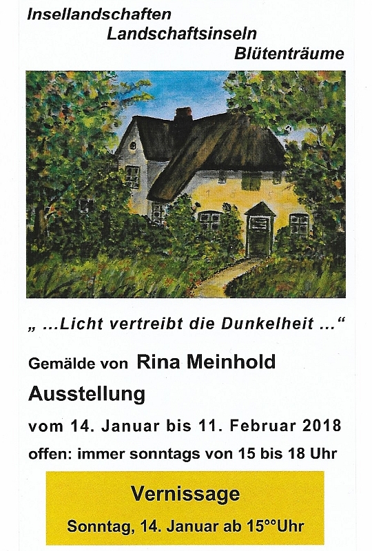 Am Sonntag, dem 14. Januar 2018, findet ab 15:00 Uhr im Schollen-Treff-Wittenau (Alt-Wittenau 41b) die Vernissage der Kunstausstellung "Insellandschaften-Landschaftsinseln-Blütenträume" von Rina Meinhold statt.