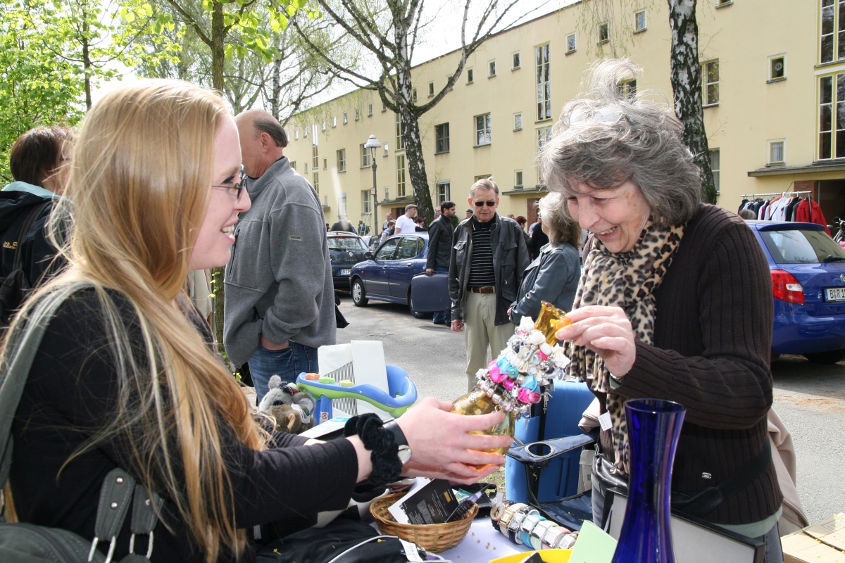 Das besondere Merkmal dieses Flohmarktes ist, dass die Kontakte mit den Nachbarn mindestens eine eben so wichtige Rolle spielen wie das Handeln, Kaufen und Verkaufen. Darum waren in denm vergangenen Jahren die Stände im Schollenhof, an denen Beiratsmitglieder - unterstützt von weiteren freundlichen Helfern - frisch gebrutzelte Rostbratwürste sowie Kaffee und kalte Erfrischungsgetränke zu äußerst bescheidenen Preisen feilboten, ein gefragter Treffpunkt.