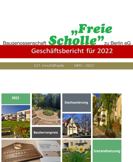 Hier haben Sie die Möglichkeit, sich die jährlich erscheinenden Geschäftsberichte der Baugenossenschaft "Freie Scholle" zu Berlin eG als PDF-Datei herunterzuladen.