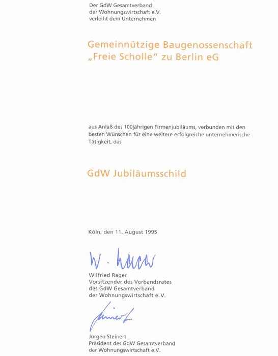 1995 erhielt die "Freien Scholle" das Jubiläumsschild des GdW