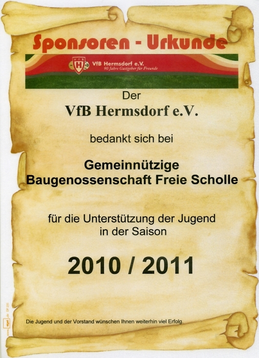 Urkunde für unsere Unterstützung der Fußball-Abteilung des VfB Hermsdorf