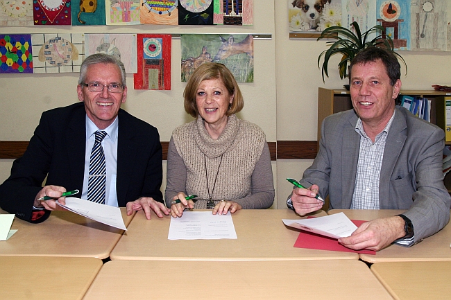 v. l.: Jürgen Hochschild ("Freie Scholle"), Margrit Fuhl (Schulleiterin), Hans-Jürgen Hube ("Freie Scholle")